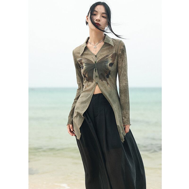 【大青龍肆シリーズ】★チャイナ風トップス★ Tシャツ 薄い 蝶々 POLOネック Vネック グリーン 緑