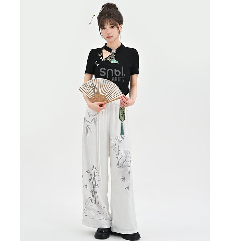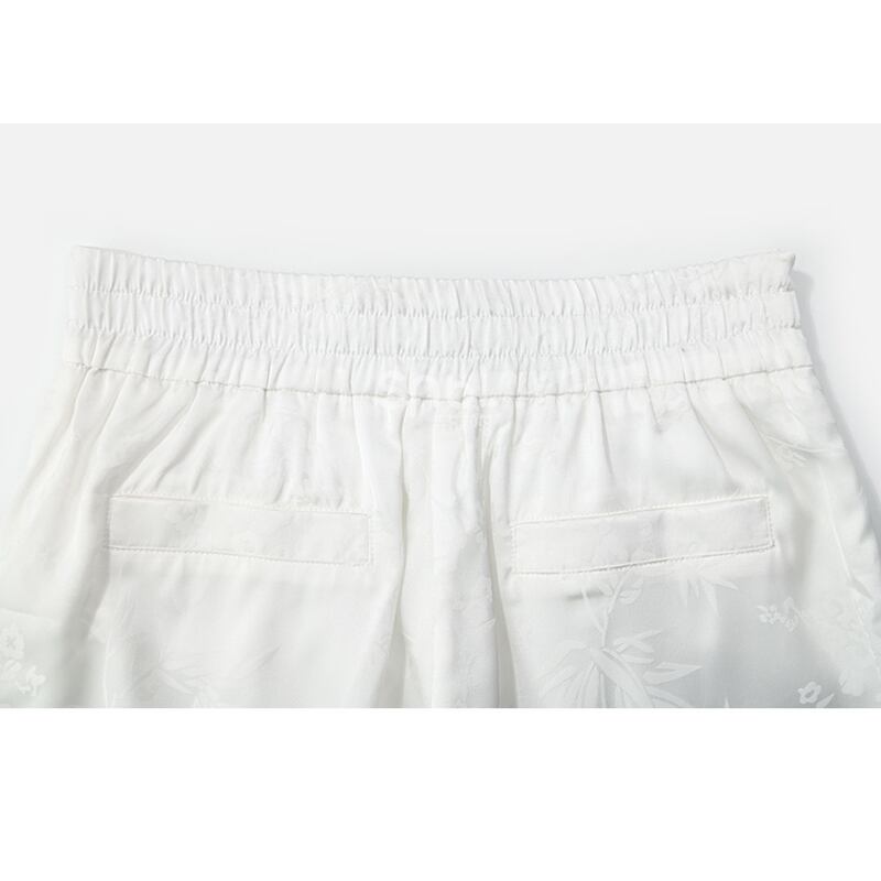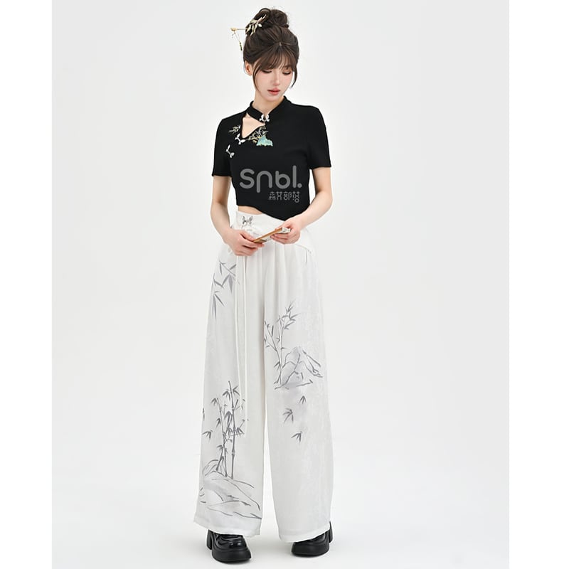 【森女部落シリーズ】★チャイナ風ズボン★ ボトムス カジュアルパンツ 竹柄 水墨柄 ホワイト 白い