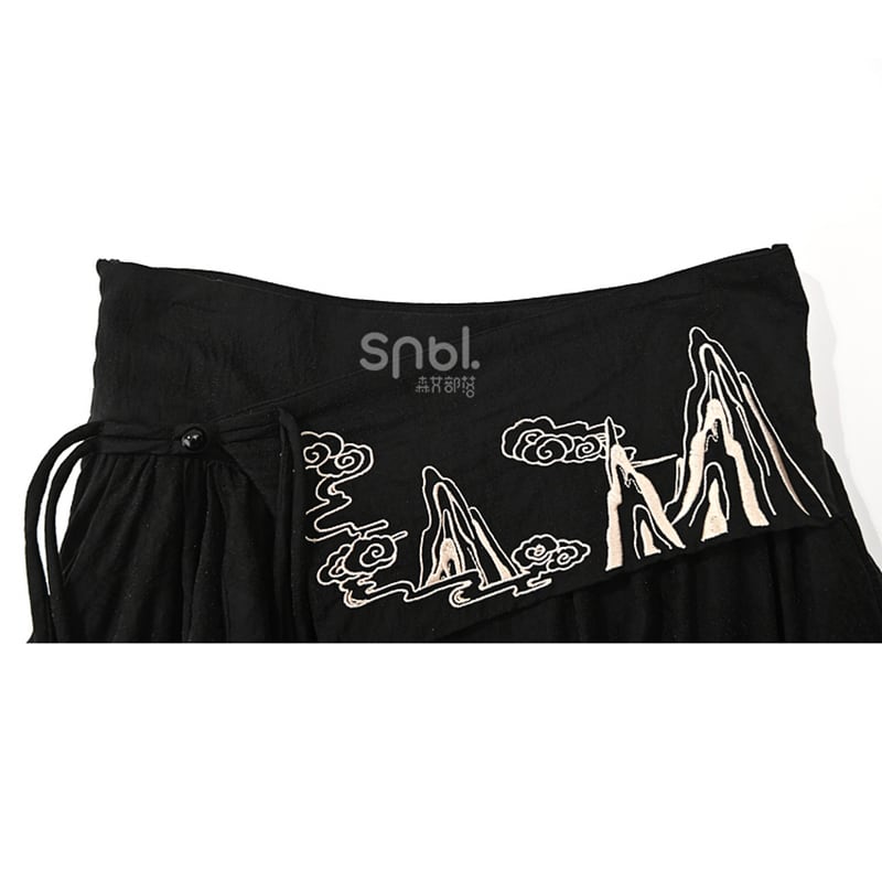 【森女部落シリーズ】★チャイナ風スカート★ ボトムス 刺繍 中華服 合わせやすい ブラック 黒い
