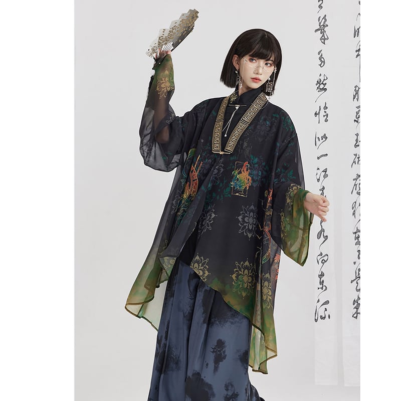 【卿棠---青銅雀羽シリーズ】★チャイナ風アウター★ 法被 薄い Vネック 男女兼用 プリント 可愛い 中華服 漢服