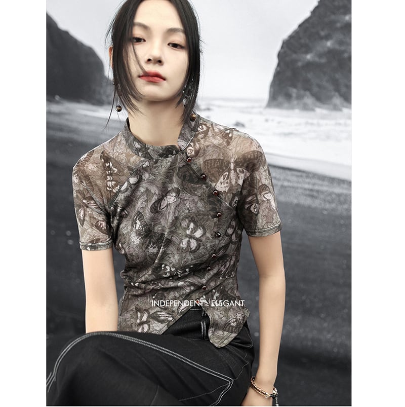 【大青龍肆シリーズ】★チャイナ風トップス★ Tシャツ レディース 蝶々 着痩せ 不規則 デザイン性有り