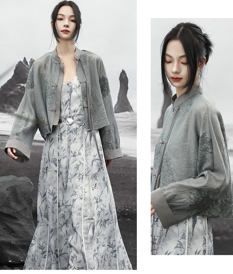 【大青龍肆シリーズ】★チャイナ風トップス★ シャツ 薄い 日差し防止 チャイナボタン 刺繍 透け感有り グレー