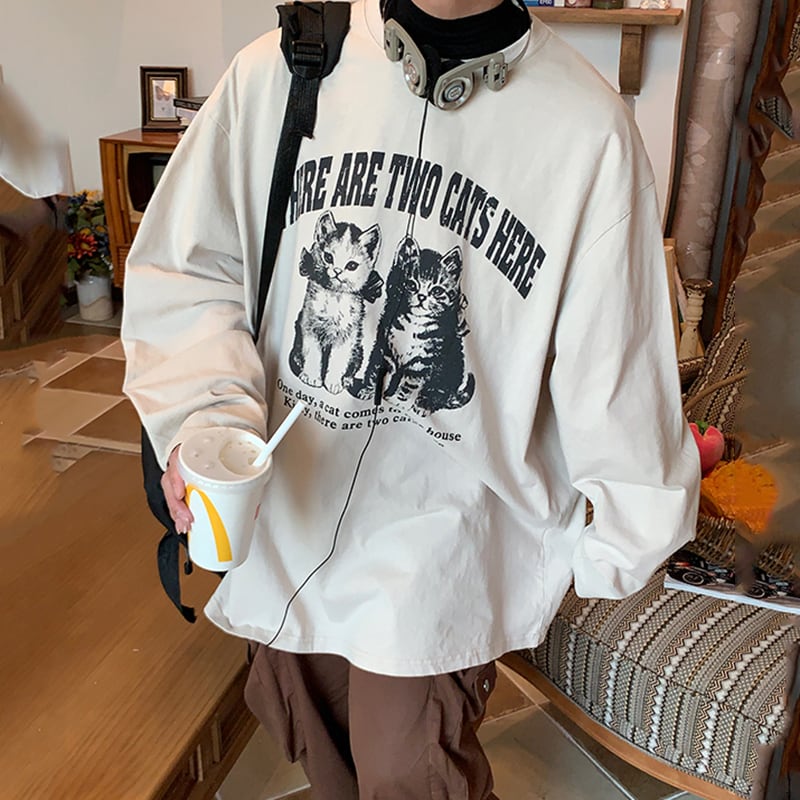 【C2シリーズ】★トップス★ 2color Tシャツ コットン レトロ 猫 猫柄 ネコ 男女兼用 メンズ カジュアル