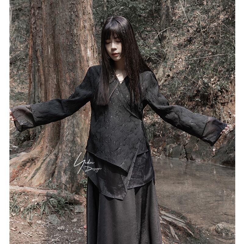 【衣篤シリーズ】★チャイナ風トップス★ シャツ 長袖シャツ Vネック 切り替え 個性的 ブラック 合わせやすい