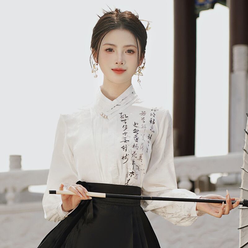 【MENGYAOシリーズ】★チャイナ風トップス★ シャツ 長袖シャツ 漢字柄 文字柄 中華服 通勤 デート 撮影 合わせやすい