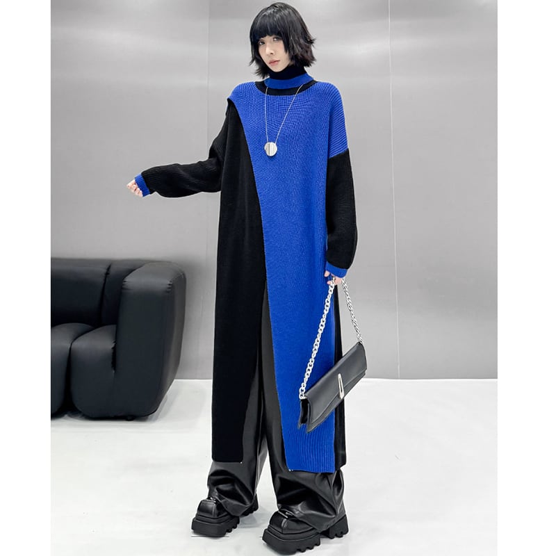 【YIDAOシリーズ】★ワンピース★ ニットワンピース 配色 着痩せ ロング丈 合わせやすい ブラック ブルー